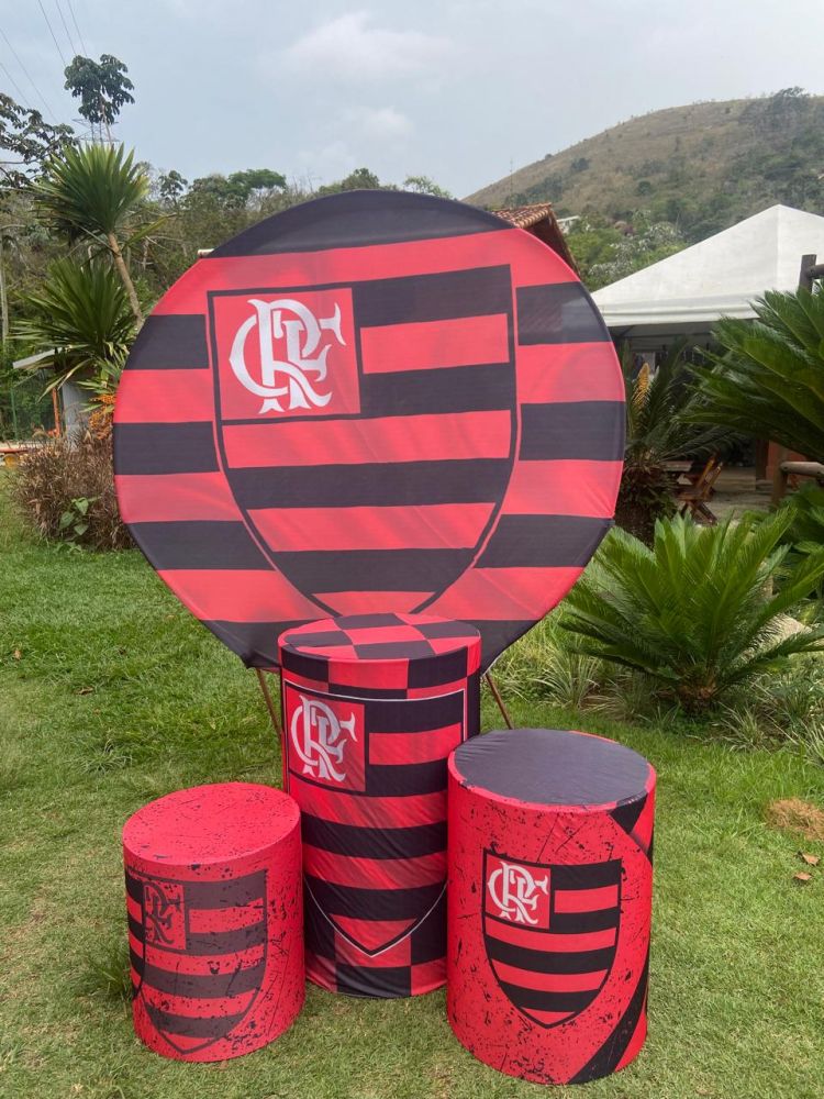 PEGUE E MONTE COM 3 CILINDROS COM CAPAS, 1 ARCO COM CAPA, 4 BANDEJAS DE TAMANHOS DIVERSOS, E 1 TAPETE