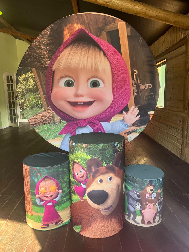 PEGUE E MONTE COM 3 CILINDROS COM CAPAS, 1 ARCO COM CAPA, 4 BANDEJAS DE TAMANHOS DIVERSOS, E 1 TAPETE